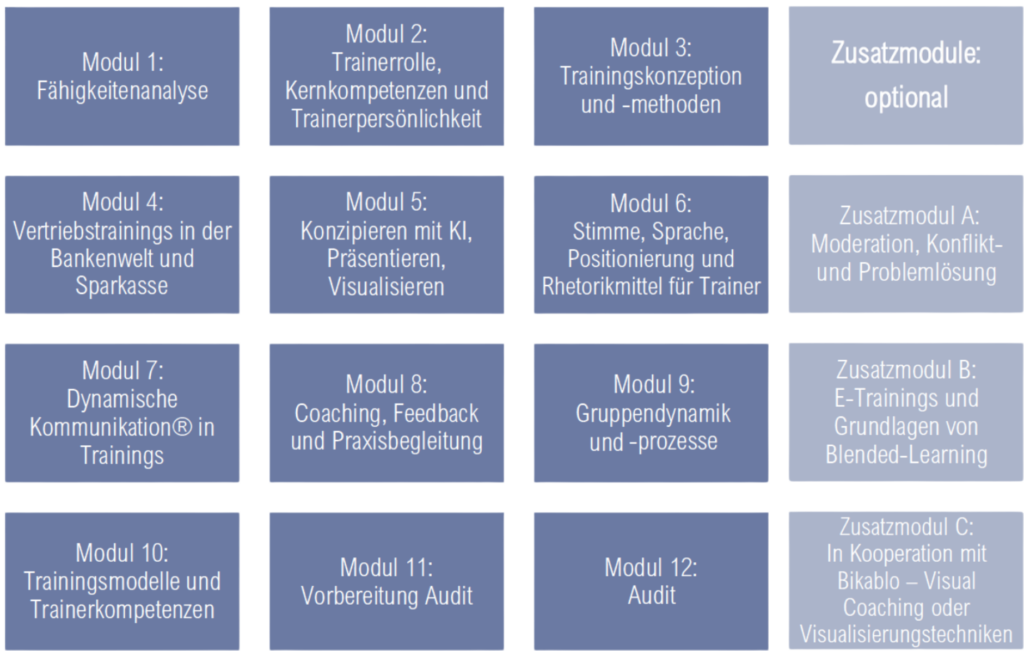 Durch die vielfältige Modulzusammenstellung ist die Ausbildung sowohl für Einsteiger als auch für fortgeschrittene Trainer geeignet.